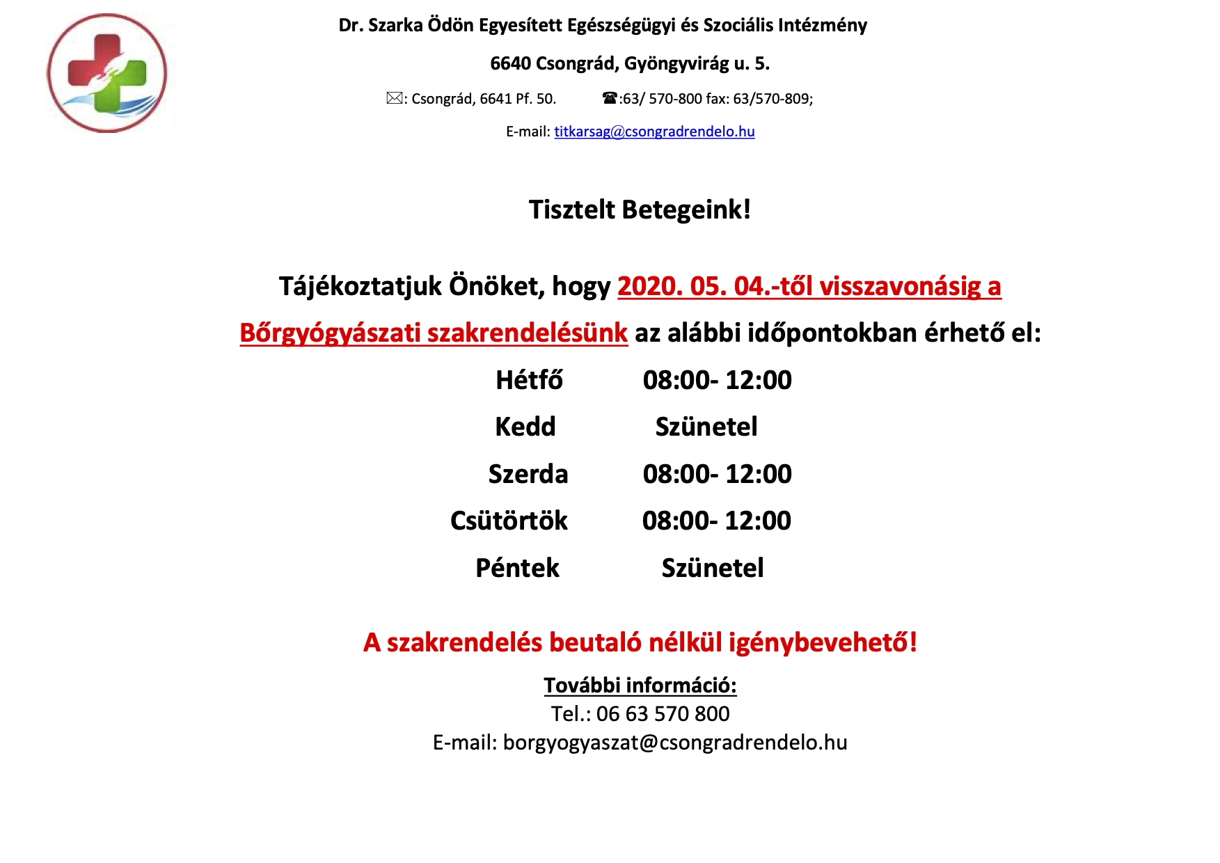 2020 05 04 Tol Visszavonasig A Borgyogyaszati Szakrendelesunk Az Alabbi Idopontokban Erheto El Csongrad