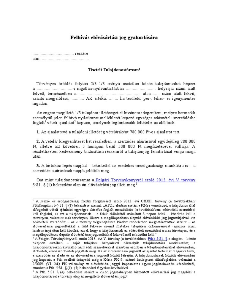 Felhivas Elovasarlasi Jog Gyakorlasara