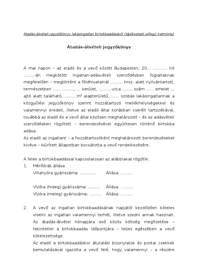 Lakás átadás átvételi Jegyzőkönyv Minta
