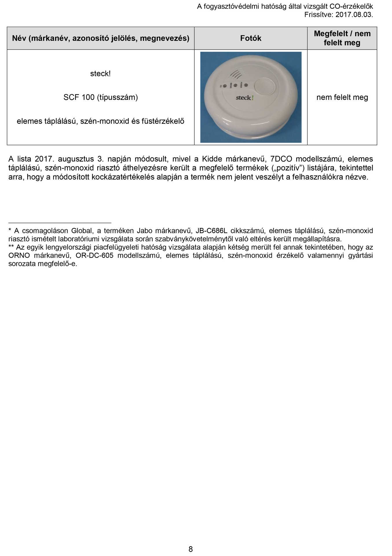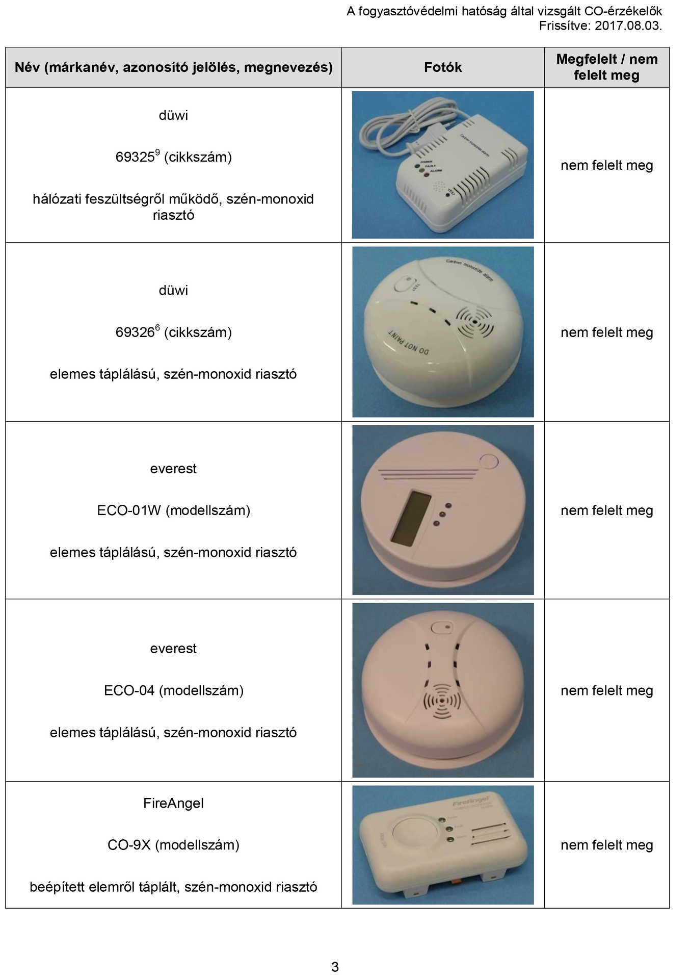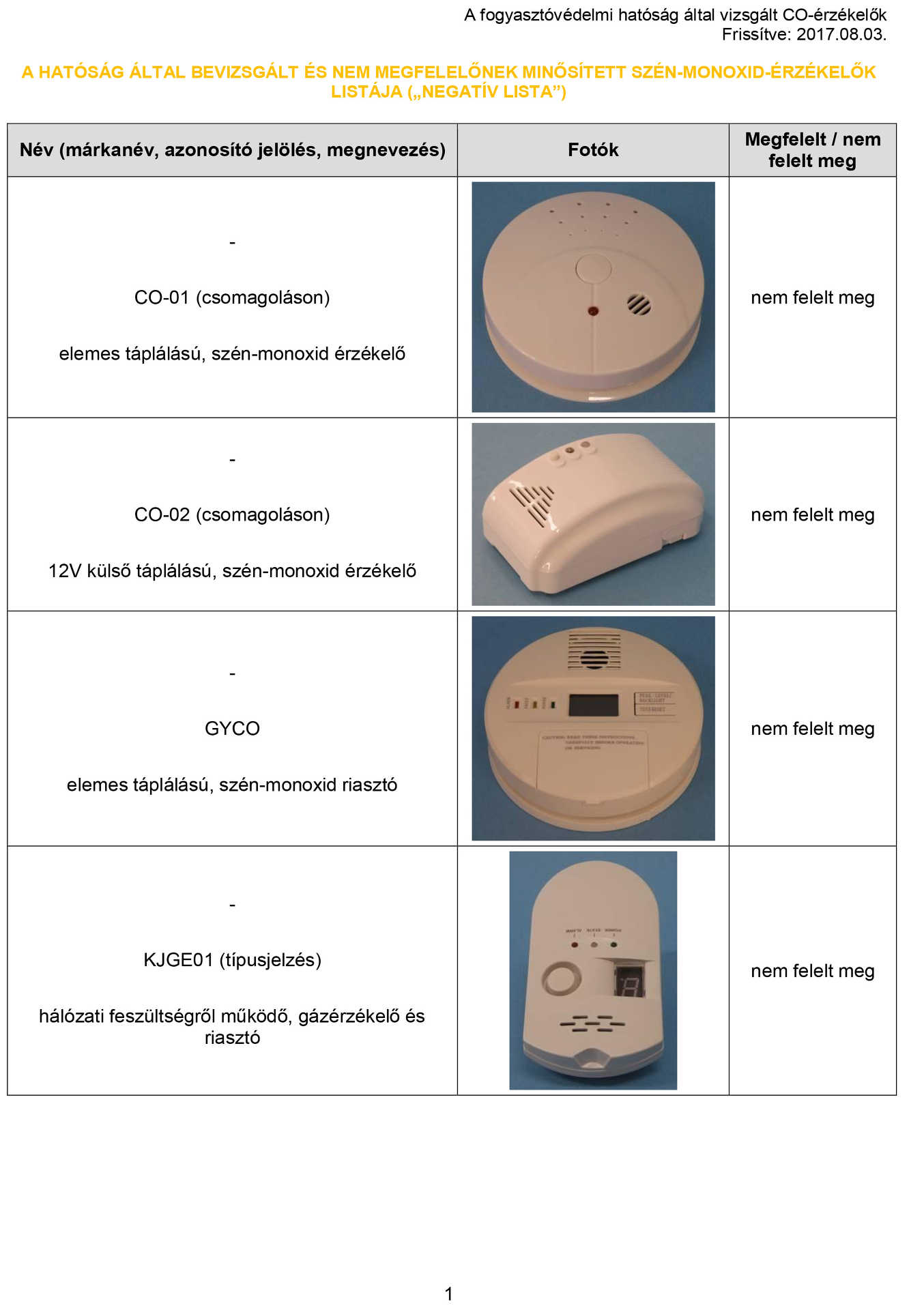 Szénmonoxid érzékelő Pozitív Lista 2018